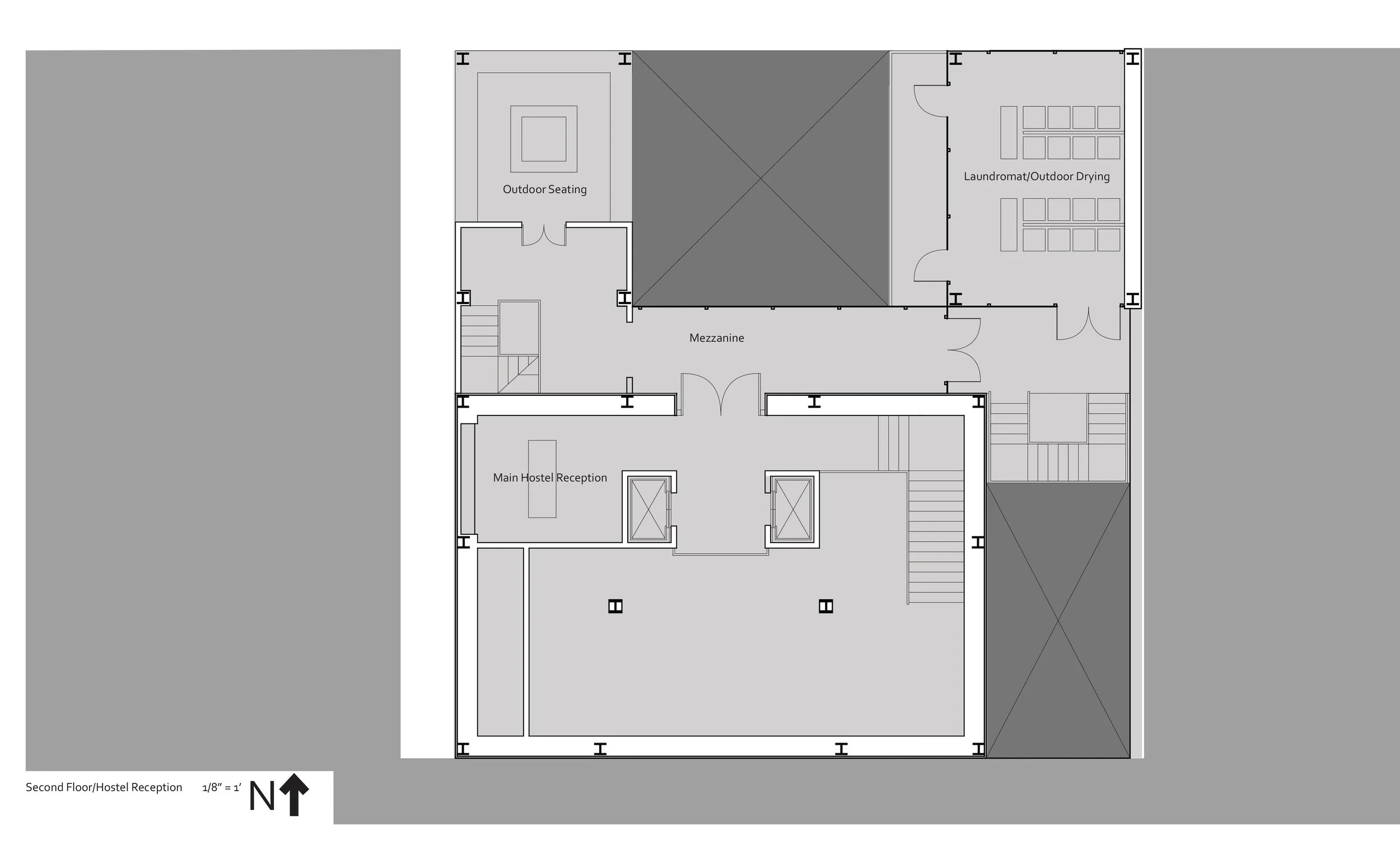 Second Floor_The second floor connects all main spaces with a mezzanine. The connected programs on the second floor of the hostel allow for short and long-term users to interact with one another.