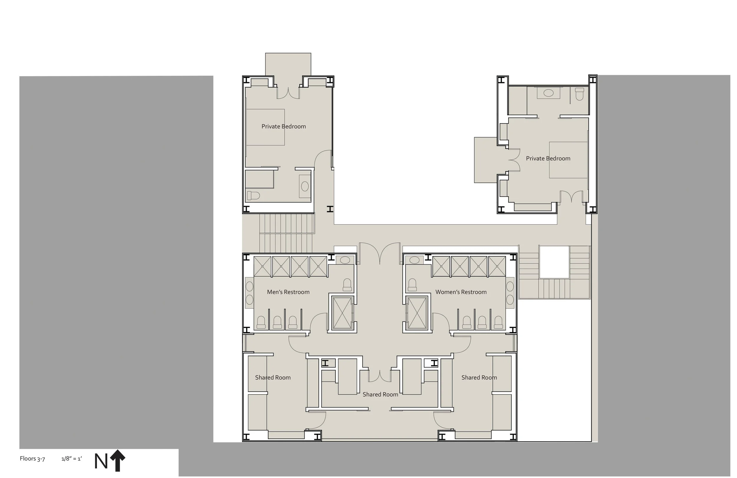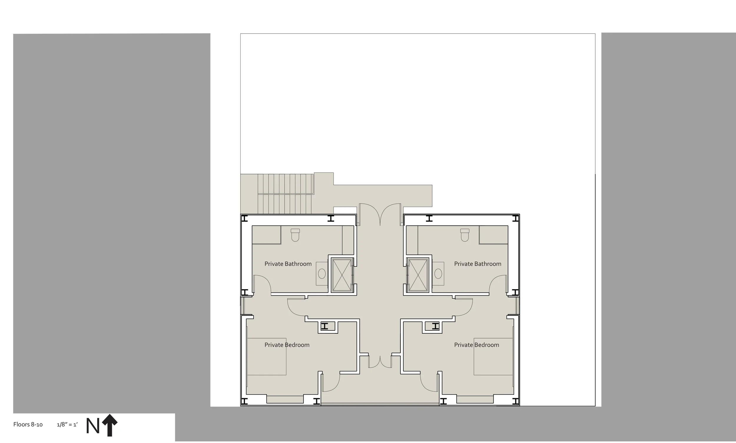 Private and shared bedrooms are arranged to allow views of downtown Baton Rouge and the Mississippi River. The exterior circulation engages both the private and shared spaces.