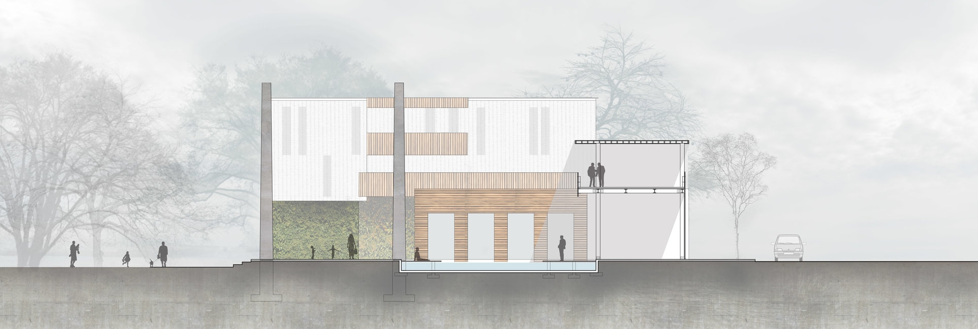 Plans and sections displaying desire to integrate laundry, bar, and community space into a single composition.